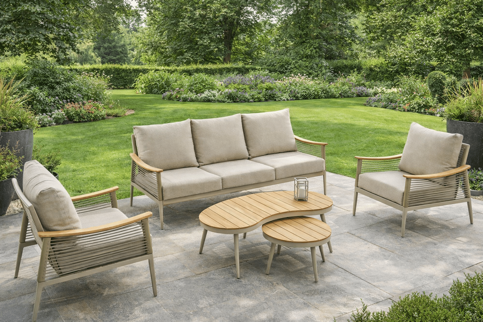 SenS-Line Sevilla loungeset 5-delig aluminium met beige kussens – De Sevilla loungeset is een stijlvolle en comfortabele toevoeging aan uw tuin of terras. Met zijn moderne vormgeving en hoogwaardige materialen creëert u moeiteloos een luxe buitenruimte waarin u optimaal kunt ontspannen.Het stevige aluminium frame is voorzien van een duurzame poedercoating, waardoor de set bestand is tegen verschillende weersomstandigheden en jarenlang mooi blijft. De armleuningen van FSC 100% teakhout geven de loungeset een warme, natuurlijke uitstraling. De verfijnde afwerking met polyester rope zorgt voor een speels en eigentijds karakter.De dikke zit- en rugkussens van 12 cm zijn uitgevoerd in sterk olefin en bieden uitstekend comfort, zodat u urenlang kunt genieten van lange zomerdagen en gezellige avonden buiten.De set bestaat uit een ruime 3-zitsbank, twee comfortabele loungestoelen en twee bijpassende tafels. De combinatie van een royale salontafel en een compacte ronde bijzettafel maakt de set niet alleen praktisch, maar ook veelzijdig in gebruik. 3-zitsbank: 82 × 190 × 78 cmLoungestoelen: 82 × 72 × 78 cmSalontafel: 119,5 × 61 × 42 cmBijzettafel: Ø51,5 × 34 cm Moderne uitstraling met hoogwaardige materialen Onderhoudsvriendelijk en weerbestendig Comfortabele kussens van 12 cm dik Stijlvolle combinatie van aluminium, teak en rope Complete set voor een luxe buitenbeleving