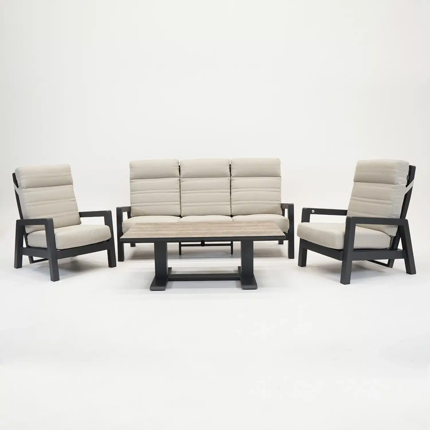 Ben jij op zoek naar een comfortabele loungeset voor buiten? Dan kan de Valerio loungeset van het merk Sens-Line echt niet ontbreken. Deze loungeset bestaat namelijk uit een 3-zitsbank, twee loungestoelen én een tafeltje, waardoor dit een complete loungeset is waar je met het hele gezin (5 personen) op kunt zitten. Je kunt zelfs de rugleuning van de loungestoelen eenvoudig verstellen door middel van het knopje aan de binnenkant van de armleuning. Hierdoor kun je de loungestoel zelfs in een liggende positie zetten. Ook de tafel is in hoogte verstelbaar (51 – 69 cm), waardoor je de ideale positie kunt instellen. Door deze mogelijkheden kun je de loungeset zo comfortabel mogelijk maken. Dit comfort wordt versterkt door de licht aflopende zitting en de rugleuning die naar achteren lopen. Ook worden er dikke zit- en rugkussens meegeleverd die voor een optimaal zitcomfort zorgen. De rugkussens kun je zelfs aan het frame vastmaken, zodat de kussens niet gaan verschuiven en ze dus op de juiste positie blijven zitten.