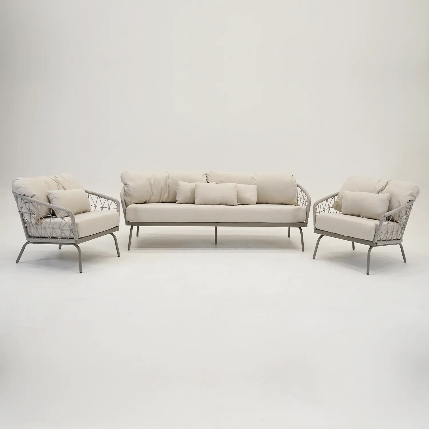 De stoelen en bank bestaan uit dezelfde opbouw van materialen. De frames van de stoelen en banken zijn gemaakt van het materiaal gepoedercoat aluminium. Gepoedercoat aluminium is een materiaal dat sterk is, maar ook licht van gewicht is. Gepoedercoat aluminium is verder ook een onderhoudsvriendelijk en ook weerbestendig en dus duurzaam materiaal. Door de poedercoating zit er dus een extra beschermlaagje op het frame, dat extra beschermt tegen krassen. De rug- en armleuningen zijn afgewerkt met rope. Dit is een duurzaam, onderhoudsvriendelijk, kleurvast, uv-bestendig, waterafstotend en weerbestendig materiaal. De meegeleverde kussens gemaakt van Olefin. Dit is een onderhoudsvriendelijk, schimmelbestendig, kleurvast, uv-bestendig en weersbestendig materiaal. Je kunt de set dus in principe het gehele jaar door buiten laten staan, maar mocht je de levensduur van je loungeset toch willen verlengen raden wij aan om deze tijdens de wintermaanden af te dekken met een tuinmeubelhoes. Of om deze tijdens de wintermaanden ergens droog op te bergen.