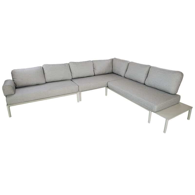 Keystone hoekset sunny crème. De hoekset Keystone bestaat uit 2-zitsbank met hoek, een 2-zits middenstuk, een 2-zitsbank met linker/rechter armleuning een een zijtafel. De set wordt geleverd inclusief kussens.