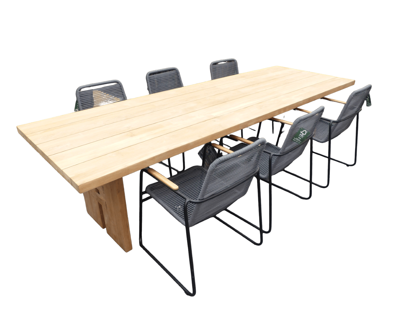 Set van Zen tafel 300x100x75 cm teak en 6 Wasabi stoelen grijs incl. kussen. Grote Zen teak tafel met 6 grijze Wasabi stoelen inclusief kussens voor een moderne en gezellige setting.