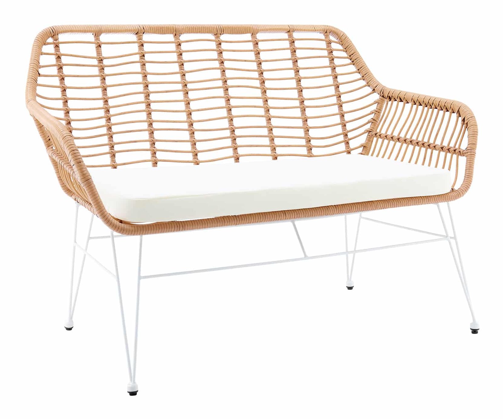 De trendy bank maakt indruk met zijn zitting en rugleuning in natuurlijke rotanlook en een stevig metalen frame in zwart. Dit bankje is weerbestendig en daardoor geschikt voor binnen en buiten. Het stevige metalen frame zorgt niet alleen voor een stabiele stand, maar biedt ook een mooi contrast met de rotan-look. De comfortabele zitschaal, die gemaakt is van 100% polypropyleen, biedt je een aangenaam zitcomfort. Een extra zitkussen in de kleur zwart maakt de look compleet. Een vleugje vakantiegevoel voor je woon- of tuinruimte!
