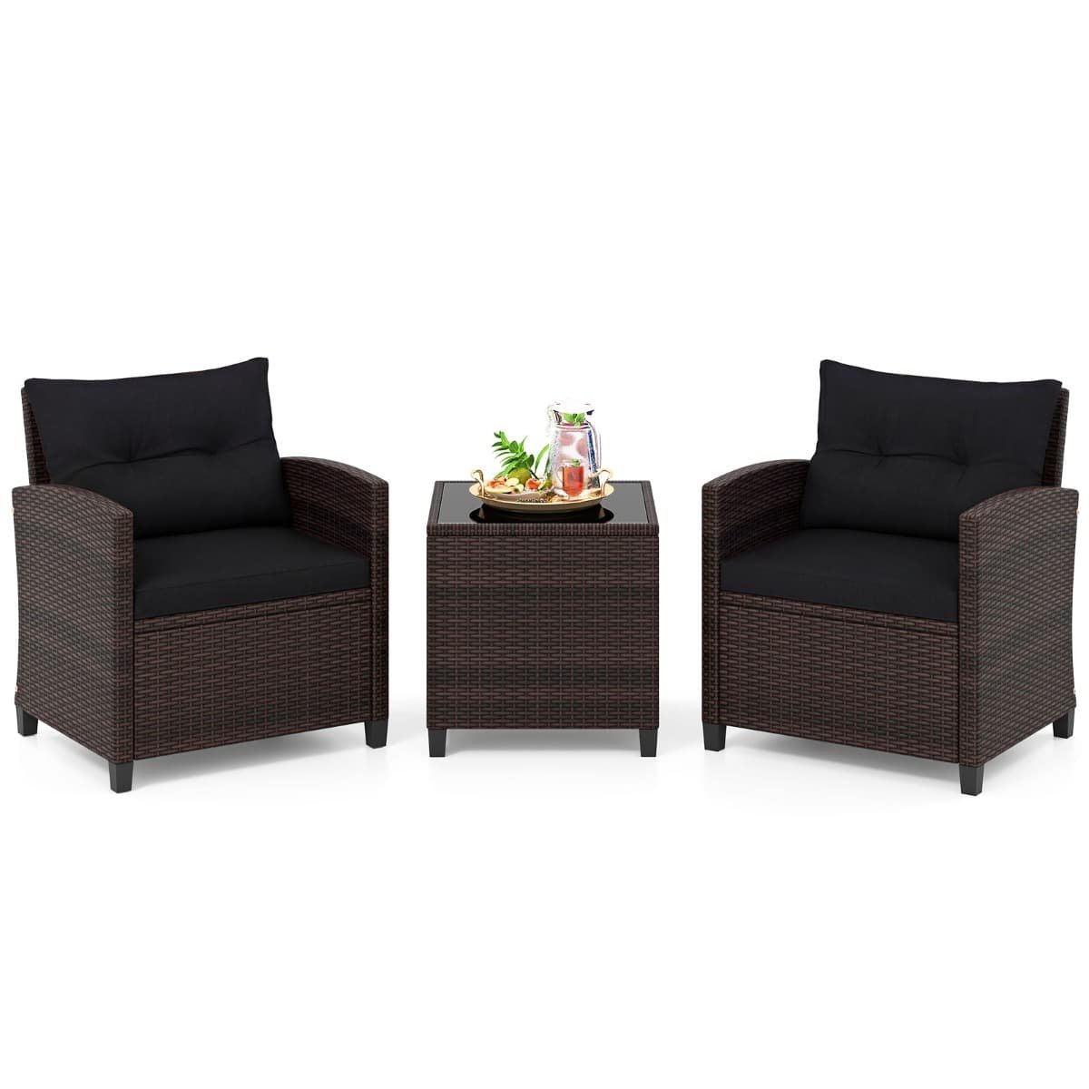 3-delige Rotan Tuinmeubelset met 2 Fauteuils en Tafel Tuinset voor 2 Personen Terrasmeubelen met Kussens voor Tuin en Balkon Zwart
