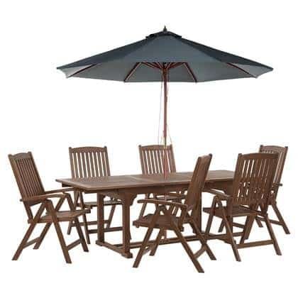 Bereid je tuin voor op warme dagen en tover hem om in een chique eethoek met deze tijdloze set, bestaande uit 6 comfortabele stoelen en een uitschuifbare tafel. Alle onderdelen zijn gemaakt van robuust acaciahout in een donkere kleur – dit materiaal