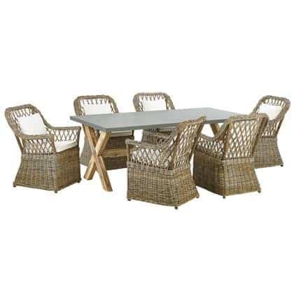 Maak je klaar voor de zomer en verander je terras in een stijlvolle eethoek. Deze set, bestaande uit een ruime tafel en 6 rotan stoelen, garandeert het hoogste comfort. Het tafelblad is gemaakt van duurzaam vezelcement, wat zorgt voor een lange leve