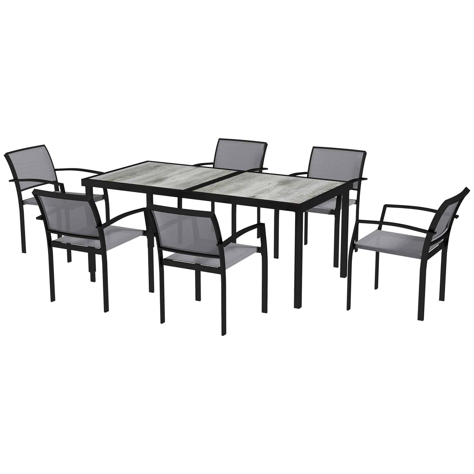 Outsunny 7-Delige Tuinset, 6 Stoelen, 1 Tafel, Stapelbaar, Onderhoudsvriendelijk, Stalen Frame, Tuinmeubelset, Grijs