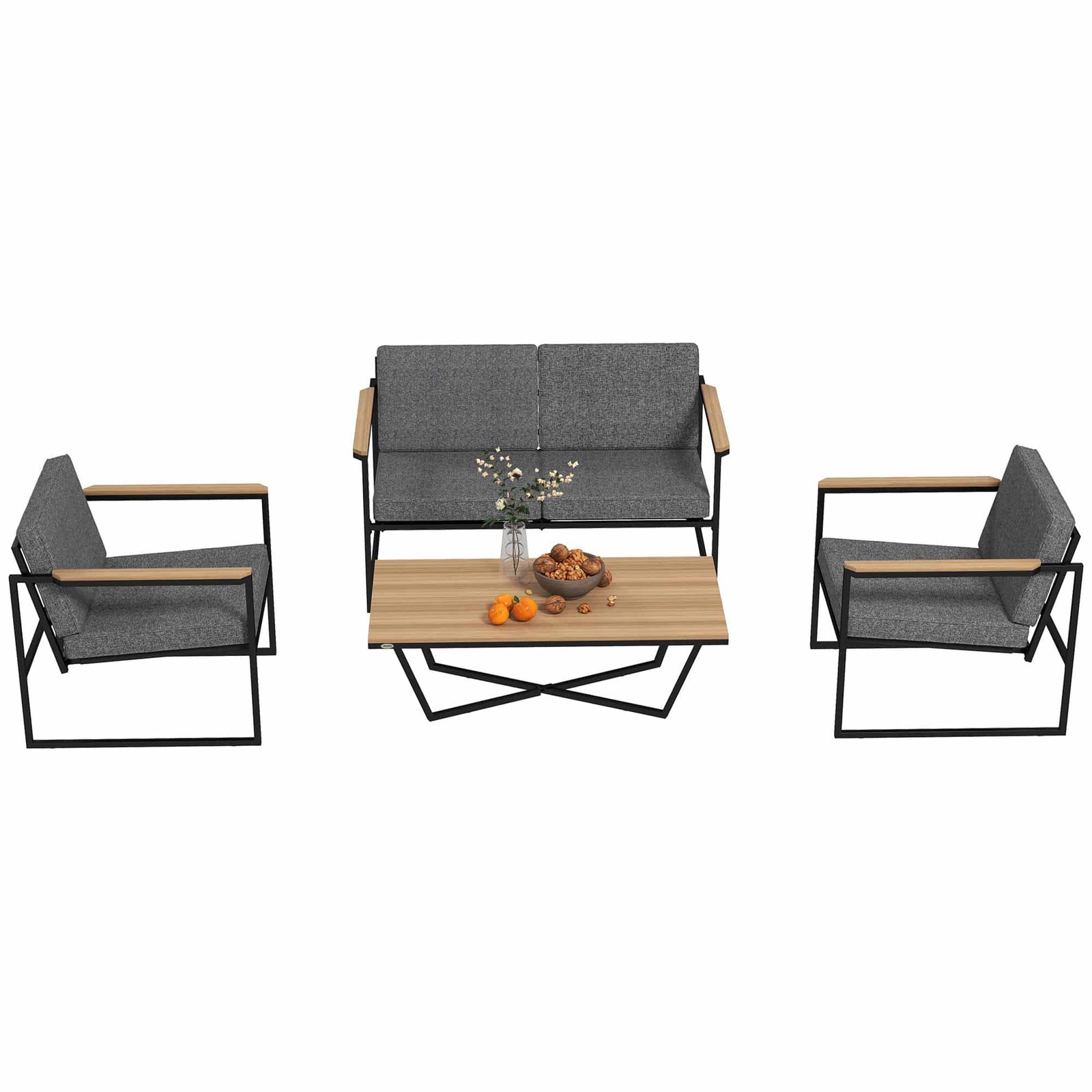 Transformeer uw tuin in een oase van welzijn met de Outsunny vierdelige tuinset! Inbegrepen zijn twee fauteuils met armleuningen, een tweezitsbank en een salontafel, allemaal uitgerust met dikke, verticale 3D-katoenkussens voor optimaal comfort. Het elegante, poedergecoate metalen frame en de hout-kunststof composietoppervlakken van het balkonmeubilair bieden een aantrekkelijke en ontspannende ambiance. De kussens met rits van het balkonmeubilair zijn gemakkelijk te reinigen.