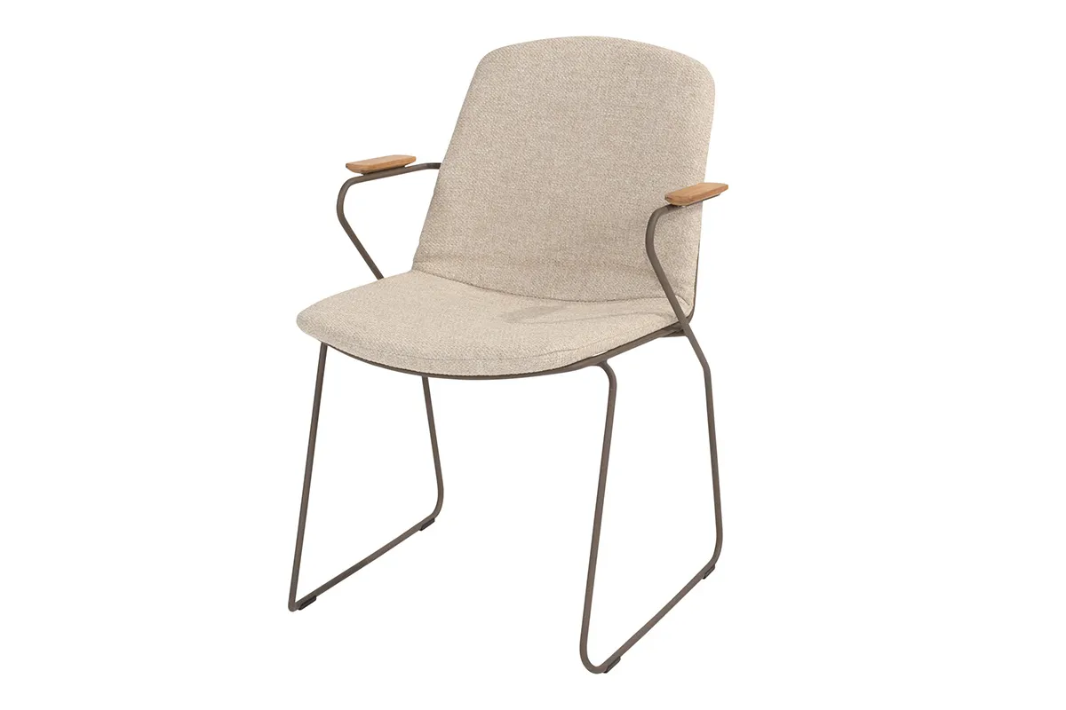 Introductie 4 Seasons Veneto stapelstoel TerreHet 4 Seasons Outdoor Veneto stapelstoel Terre van Fonteyn transformeert jouw buitenruimte tot een elegante oase van comfort en stijl. Deze verfijnde tuinstoel kenmerkt zich door hoogwaardige materialen en doordacht design dat perfect aansluit bij moderne tuintrends. De warme terretint creëert een uitnodigende sfeer die harmonieus samengaat met natuurlijke omgevingen en eigentijdse terrassen.nnWarme uitstraling vol elegantieErvaar natuurlijke warmte door de rijke terrekleuren die perfect aansluiten bij aardse tinten in jouw tuin. Het verfijnde ontwerp met RVS frame en teakhouten accenten geeft jouw buitenruimte een luxueuze en gastvrije uitstraling. De volledig gestoffeerde zitting en rugleuning in zachte beige tinten met subtiele melering voegen visuele diepte toe die gasten direct laat voelen dat comfort vooropstaat.nnPerfecte functionaliteit voor optimaal comfortGeniet van uitstekende ondersteuning dankzij de hoge rugleuning die geleidelijk taps toeloopt en de natuurlijke contouren van jouw lichaam volgt. Het stabiele sledevormige onderstel met gebogen metalen buizen zorgt voor stevigheid tijdens gebruik, terwijl de teakhouten armleuningen praktische armsteun bieden. De zithoogte van 47 cm maakt comfortabel zitten mogelijk voor verschillende lichaamslengtes.nnGemakkelijk stapelbaar voor maximaal gebruiksgemakRealiseer seizoensopslag en flexibele tuininrichting moeiteloos dankzij het stapelbare ontwerp. De compacte afmetingen van 59 x 66 x 87 cm maken het verplaatsen en herrangschikken van meerdere stoelen eenvoudig. Deze praktische eigenschap biedt je de vrijheid om jouw buitenruimte aan te passen aan verschillende gelegenheden en weersomstandigheden, terwijl efficiënt ruimtegebruik gegarandeerd blijft.n