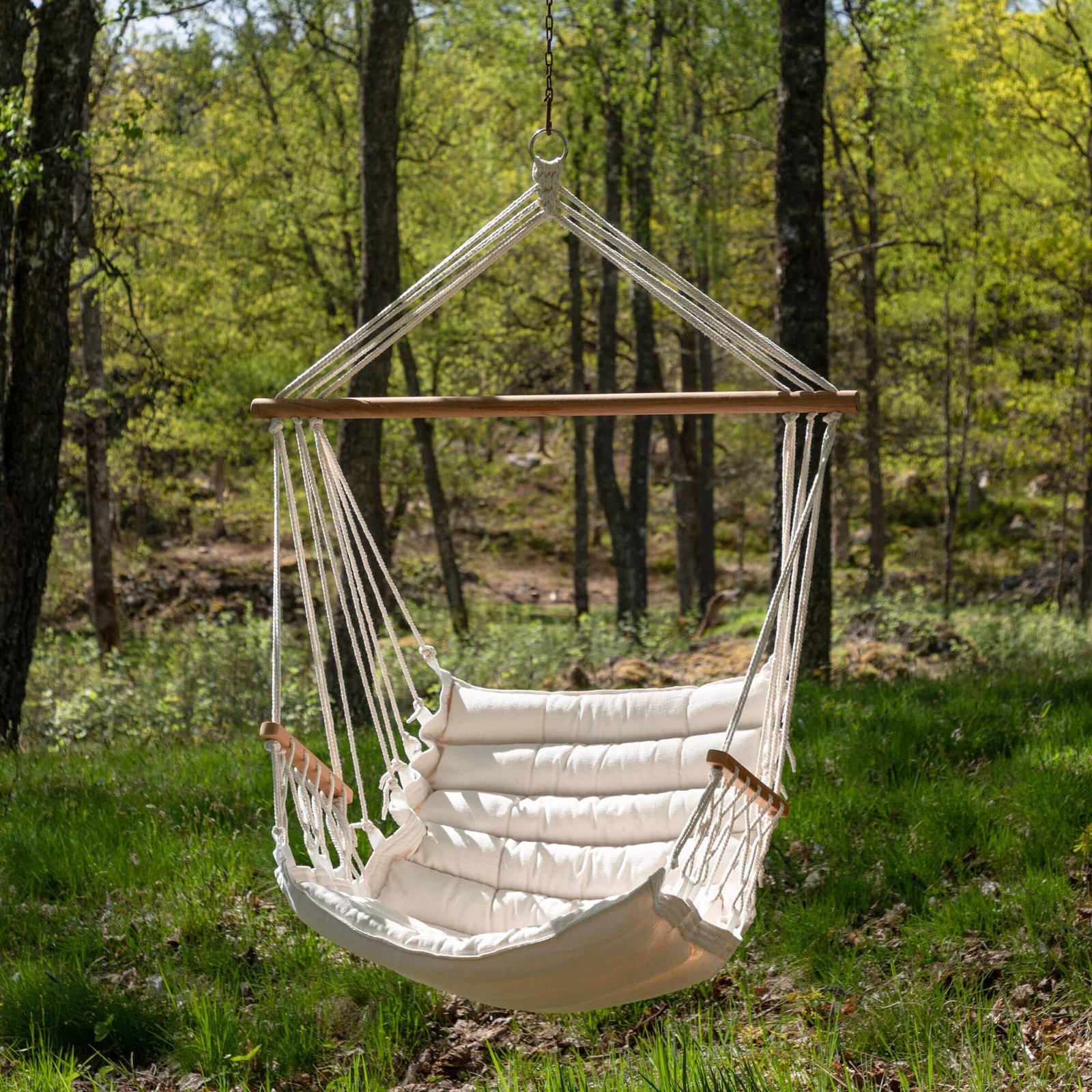 Creëer het gezelligste plekje in de tuin met behulp van een hangmat uit de Lakisa serie! Deze hangstoel heeft het allemaal: modern design, uitnodigend ontwerp en duurzaam materiaal. Het laatste is van witte polyester en katoenen stof en de touwen worden bij elkaar gehouden door decoratieve houten details. Vind je plek voor ontspanning en geniet van harmonieuze en comfortabele tijd alleen!