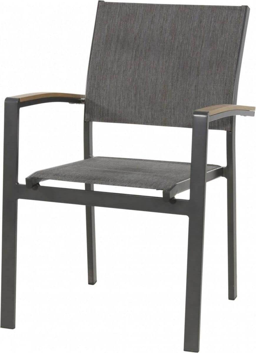 Stapelstoel Arezzo. Stapelstoel Arezzo is een handige stapelstoel van Lesli Living. Dit artikel heeft de volgende kenmerken: 57x62x87 cm aluminium frame antraciet, armleuning teaklook polywood. 490gr/m² textilene met olefin grijs/bruin design, maximaal draaggewicht: 100 kg. .