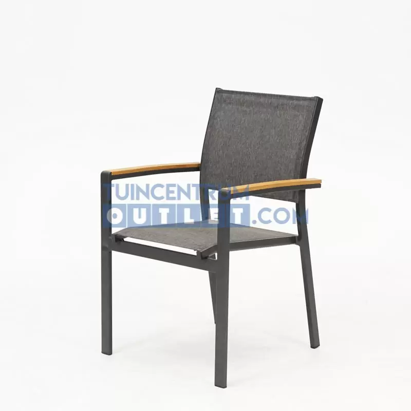Het frame van deze diningstoel is vervaardigd uit gepoedercoat aluminium. Dit materiaal is sterk, onderhoudsvriendelijk, licht van gewicht, weersbestendig en heeft door de coating een extra beschermlaag tegen weer en wind gekregen. De zitting en rugleuning zijn vervaardigd uit textileen. Textileen is sterk, duurzaam, licht van gewicht, onderhoudsvriendelijk, sneldrogend, kleurvast, weersbestendig en heeft een hoog zitcomfort. Door deze combinatie van materialen kun jij deze stoel het hele jaar door buiten laten staan.