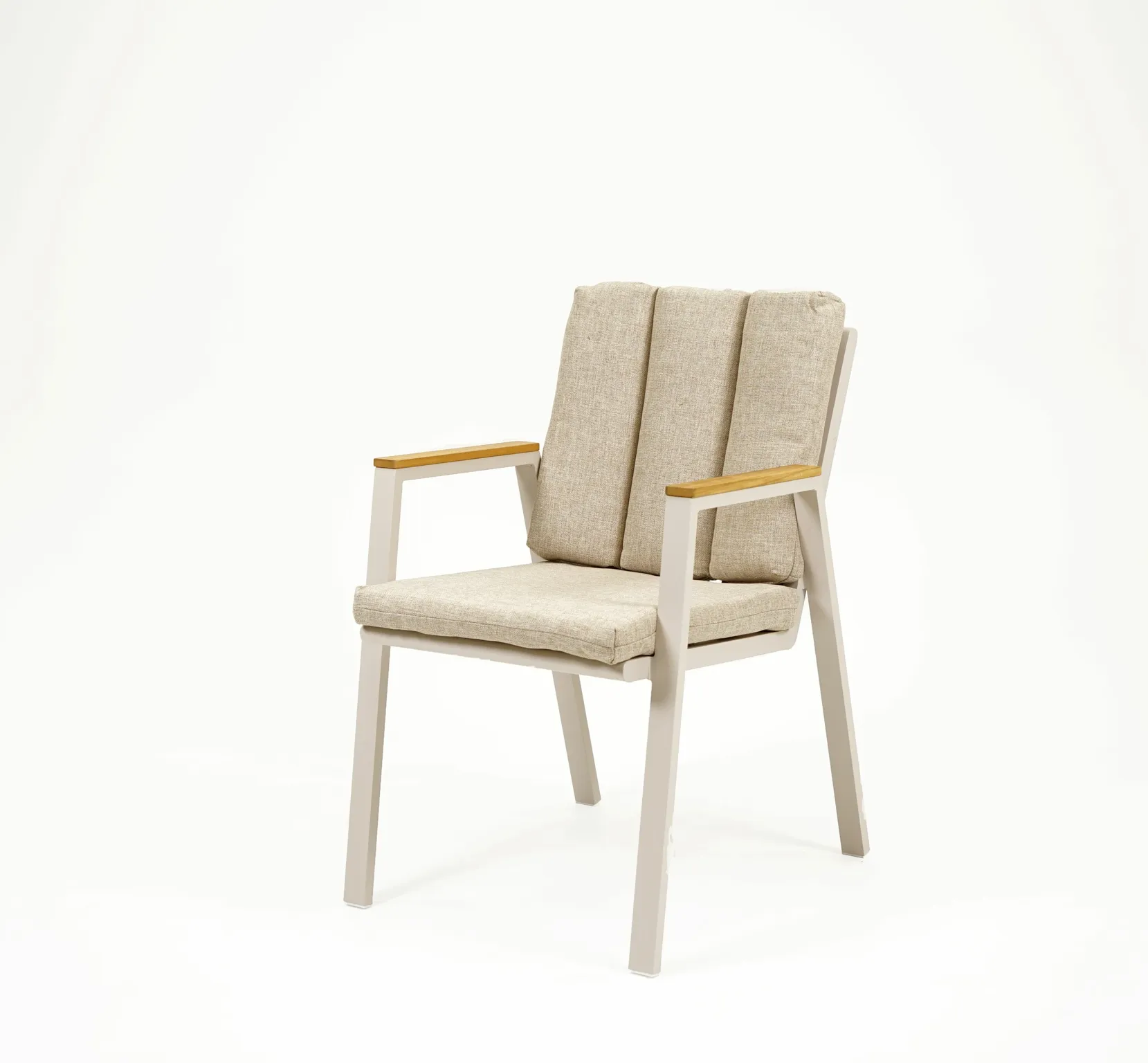 Het frame van deze stoel is vervaardigd uit gepoedercoat aluminium. Dit is een sterk, onderhoudsvriendelijk en weersbestendig materiaal dat tevens licht van gewicht is. Door de poedercoating is er nog een extra beschermlaag tegen weer en wind, krassen en stoten aangebracht. De armleggers zijn afgewerkt met hout. Dit materiaal zorgt ervoor dat de leggers niet te heet worden wanneer de stoel in de volle zon staat. De bekleding beschikt over een leren look, maar is gemaakt uit polyester. Dit materiaal is sterk, duurzaam, weersbestendig en voelt erg zacht aan. Door deze combinatie van materialen is deze stoel geschikt voor binnen- en buitengebruik.