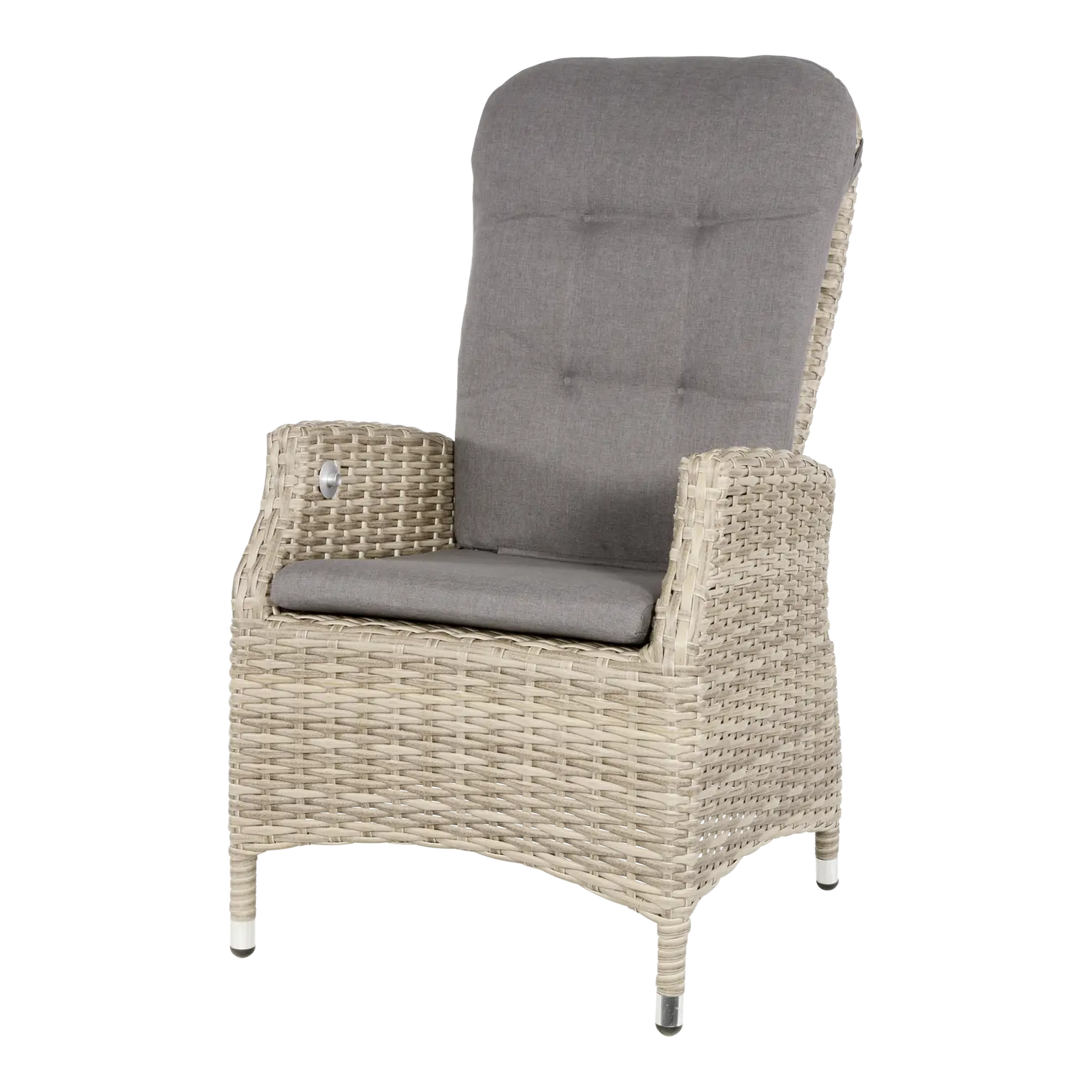 Het frame van de stoel is vervaardigd uit gepoedercoat aluminium en is afgewerkt met wicker. Het aluminium is sterk, onderhoudsvriendelijk, licht van gewicht, weersbestendig en is door de poedercoating extra beschermd, terwijl het wicker sterk, duurzaam, onderhoudsvriendelijk, uv-bestendig, vorstbestendig en weersbestendig is. Verder zijn de kussens vervaardigd uit Olefin. Dit materiaal voelt lekker zacht aan en is daarnaast sterk, slijtvast, waterafstotend, kleurvast, uv-bestendig en weersbestendig. Hierdoor is deze stoel geschikt om het hele jaar buiten te staan